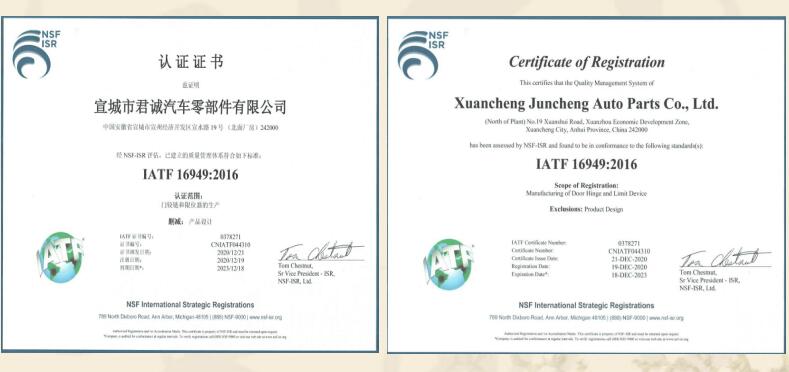 宣城市君誠汽車零部件有限公司是專業(yè)生產(chǎn)各類汽車鉸鏈及限位器的民營企業(yè),總投資3000余萬元,位于宣城高新技術(shù)產(chǎn)業(yè)開發(fā)區(qū),緊鄰宣廣、宣蕪高速公路,地理位置優(yōu)越,交通便捷。是“國家高新技術(shù)企業(yè)、知識產(chǎn)權(quán)貫標企業(yè)、安徽省商標示范企業(yè)、安徽省科技型企業(yè)”,已獲得國家發(fā)明專利18項,實用新型發(fā)明專利4項。主要從事各類汽車門鉸鏈及限位器的設計、研發(fā)、生產(chǎn)、和銷售,具有專業(yè)的合作團隊。自2015年正式生產(chǎn)至今,已形成一整套完整的生產(chǎn)、質(zhì)量管理體系。并已通過國家強制性產(chǎn)品認證“3C”體系認證及IATF16949國際質(zhì)量體系認證。在生產(chǎn)設備上,公司擁... 【查看詳細】